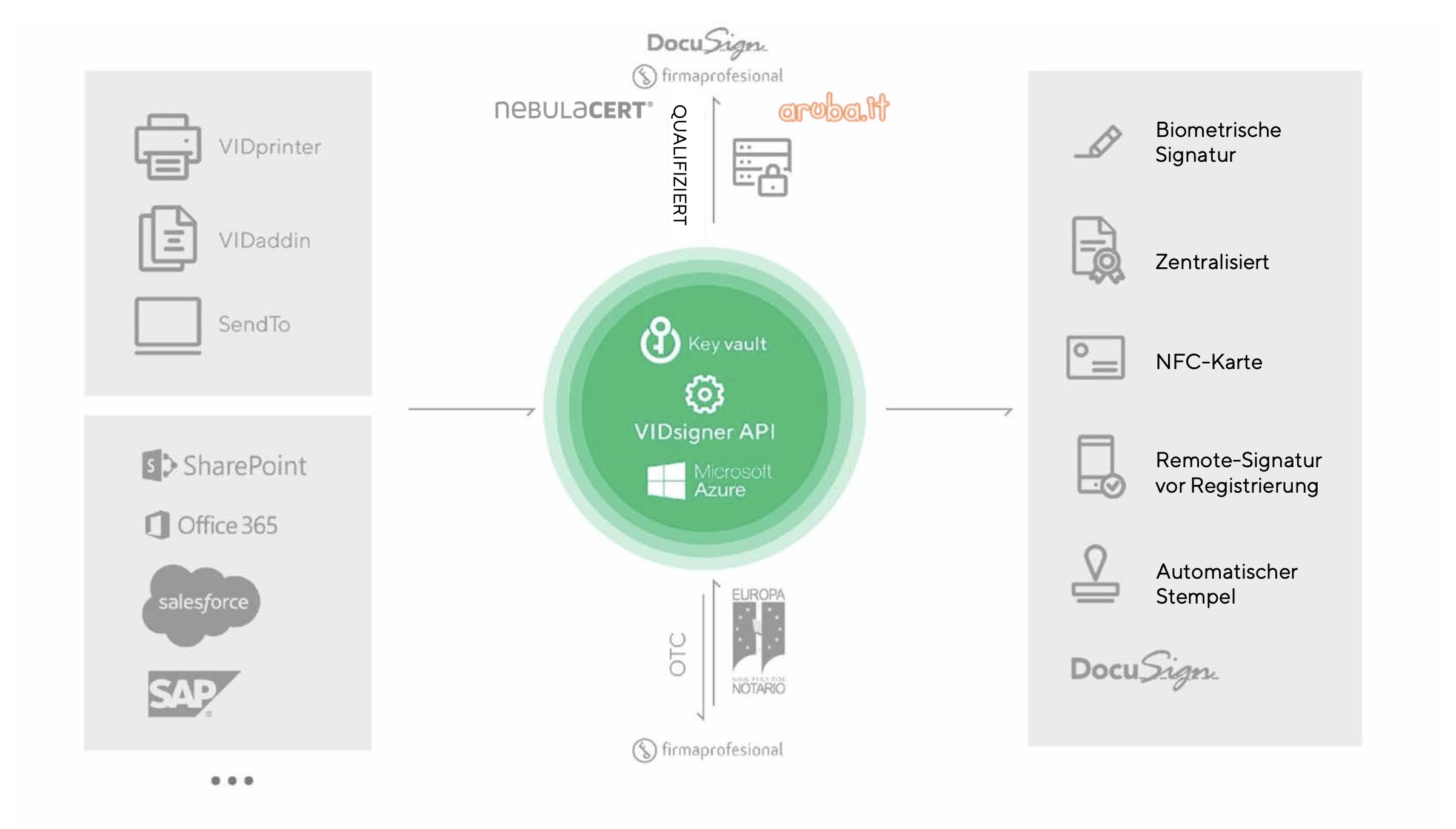 Kern der Validated ID Lösung ist der sogenannte VIDSigner bzw. die VIDSigner API. An sie knüpfen auch Marktriesen wie DocuWare